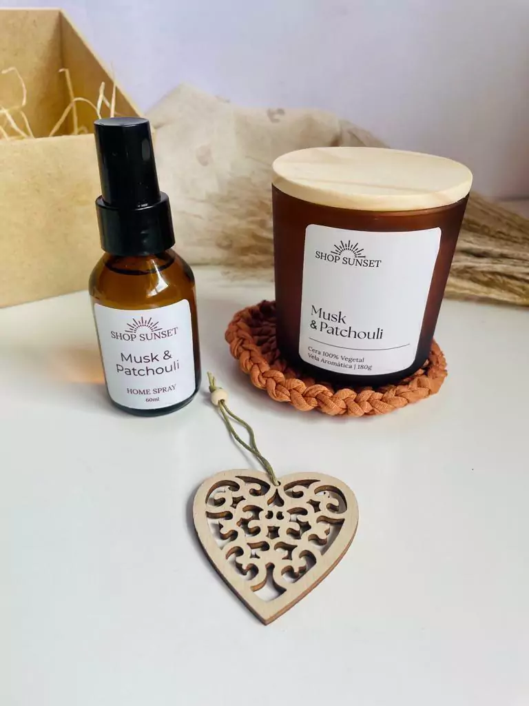 Cada detalhe do box de presente foi pensado para encantar e surpreender! Combinando elementos que evocam sofisticação e embalagem cuidadosa, este é um presente perfeito para quem busca presentear com elementos elegantes, que despertam sensação de sofisticação e beleza. A Vela e o Home Spray Musk & Patchouli da Shop Sunset possui um perfume amadeirado fresco e ousado com aroma forte e marcante, perfeito para relaxar num dia de chuva, embaixo das cobertas. Remete o aroma de uma deliciosa caminhada sobre as folhas secas em uma linda floresta no outono. Com uma vívida mistura de notas cítricas, que incluem a Verbena e o Limão, combinam-se com notas verdes do Lírio do Vale e do Acorde Verde e com a sensualidade rústica do Patchouli, do Cedro e do Musk.