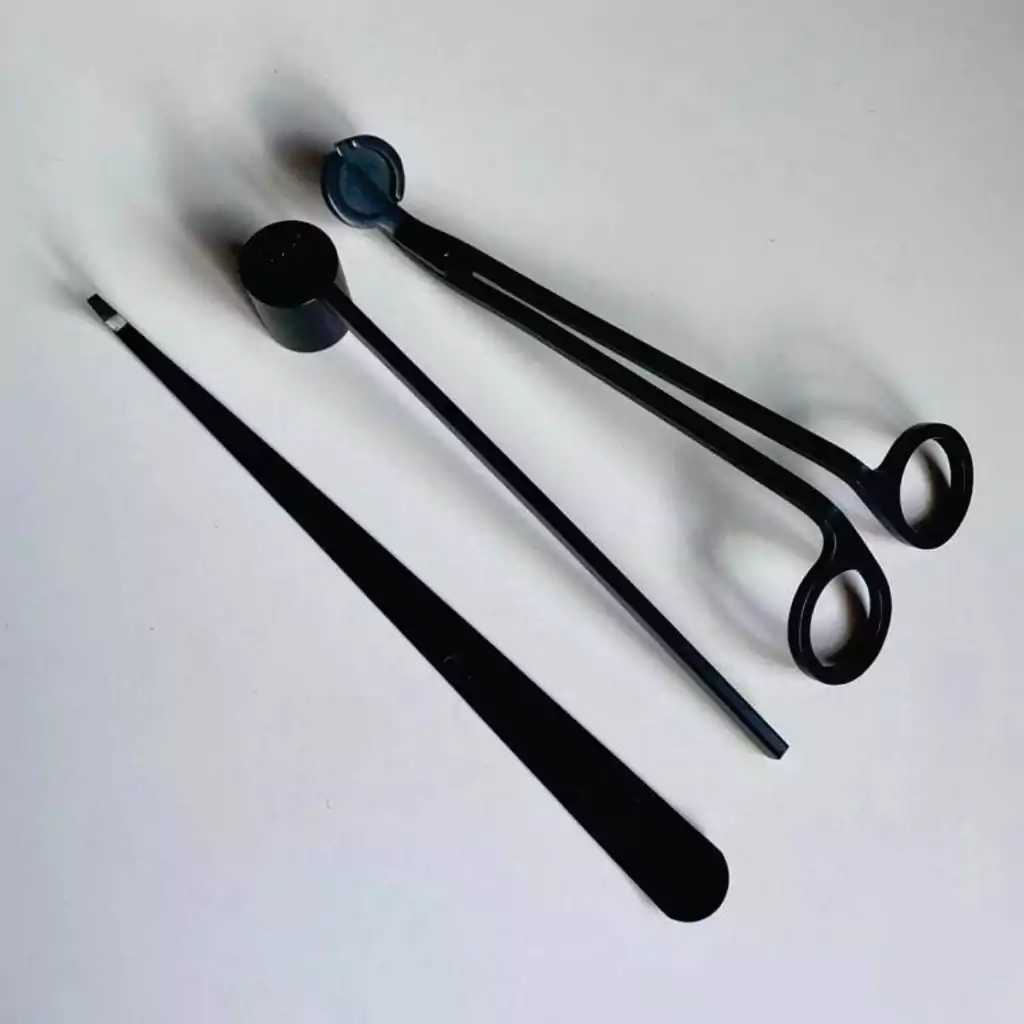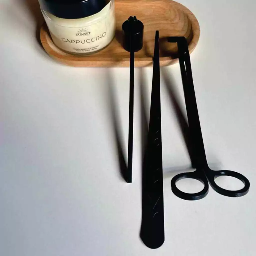 O conjunto de acessórios da Shop Sunset é formado por um aparador de pavio, abafador e pinça de vela feitos de aço inoxidável à prova de ferrugem.