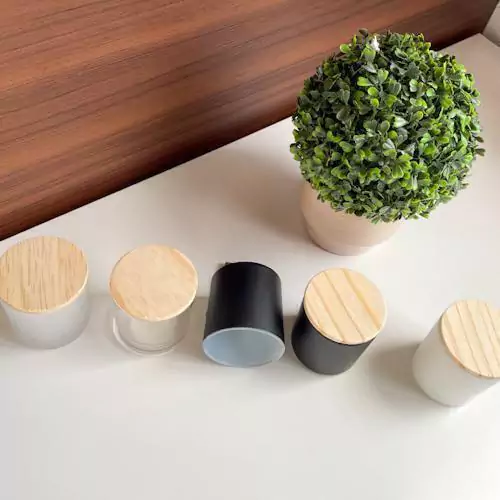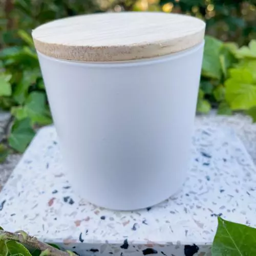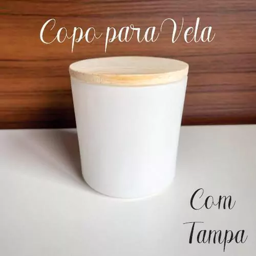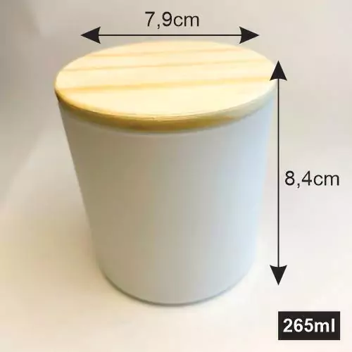 Jogo com 06 copos de vidro branco fosco (265ml) com tampa de madeira rústica para produção de vela aromática.